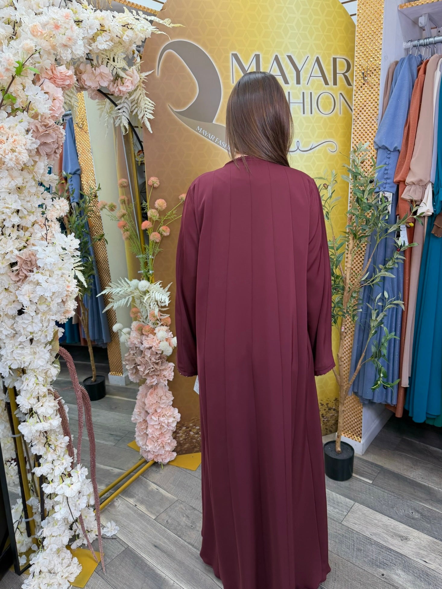 - Includes burgundy abaya, ivory underdress, and matching hijab
