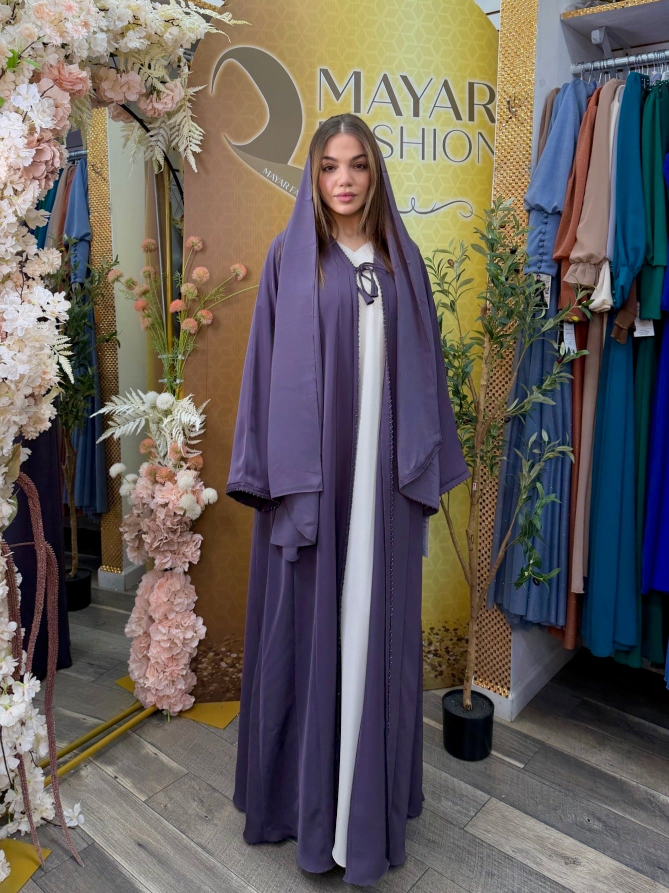 - Includes lavender abaya, ivory underdress, and matching hijab
