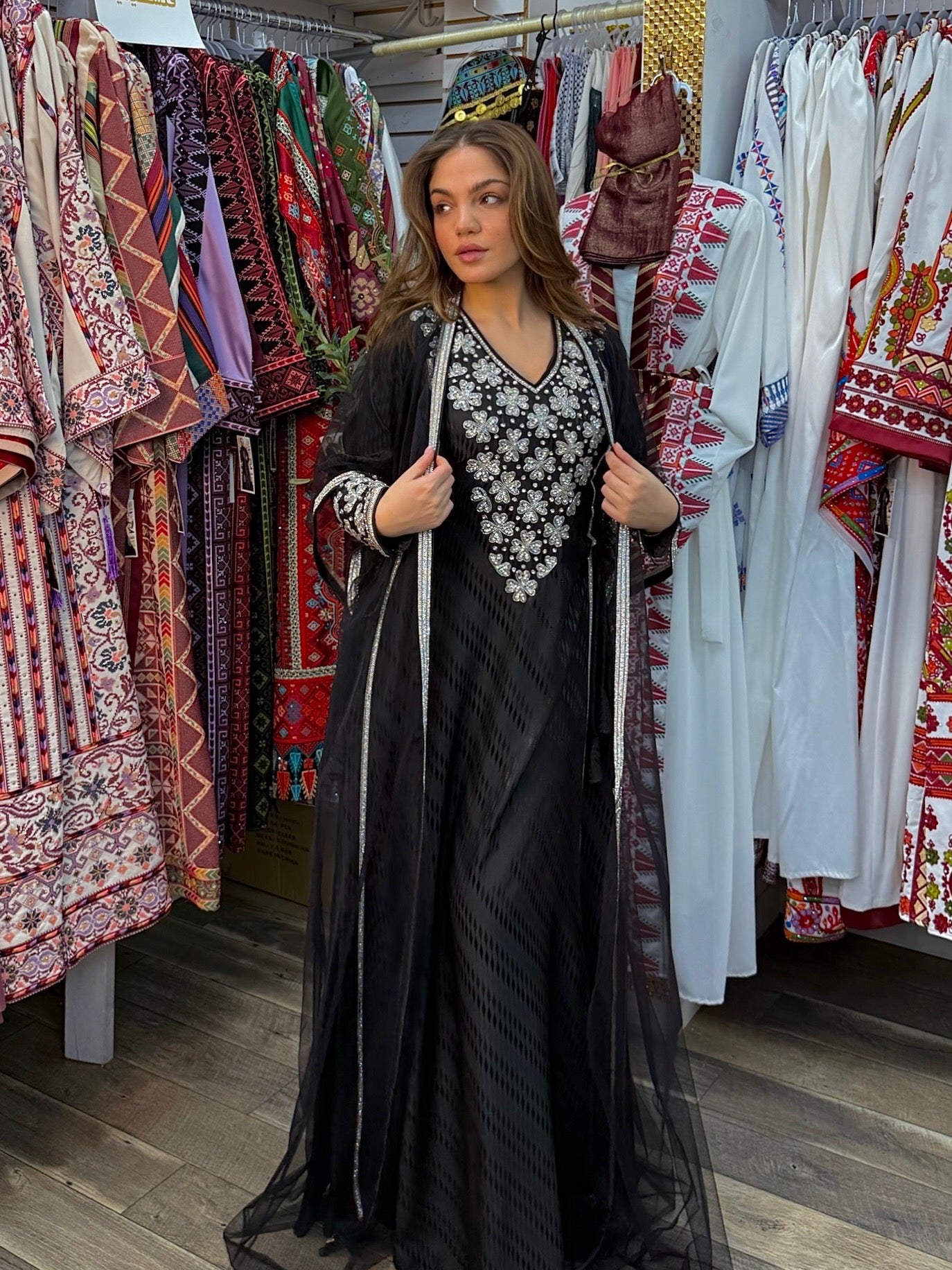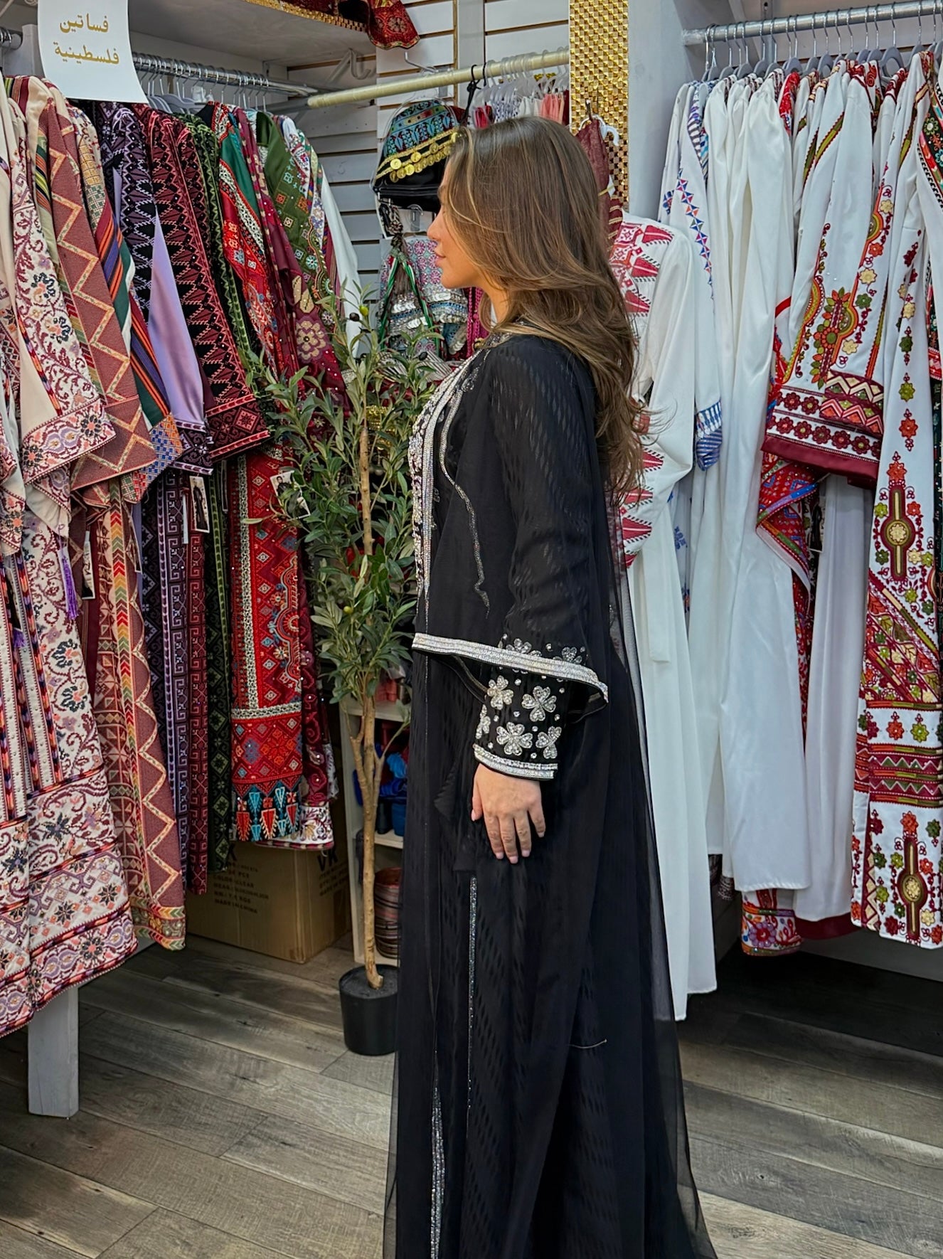 This black chiffon open abaya features delicate silver embroidery along the neckline and sleeves, creating an elegant and refined look. Designed with an open-front style and a lightweight, flowing silhouette, it drapes beautifully for a soft finish.